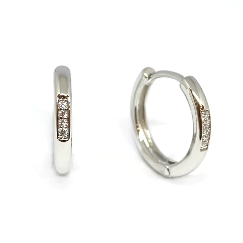 Argola com fecho click, cravejado de zircônias, com banho de ouro ou ródio branco e verniz importado