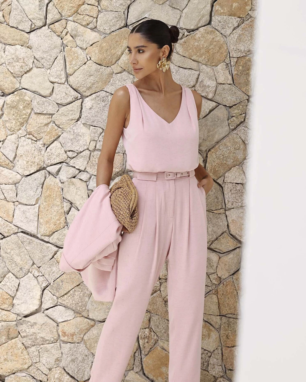 Calça em viscoline com cintura alta, pregas duplas frontais, bolsos laterais funcionais, forro ate a barra. Acompanha cinto forrado removível.